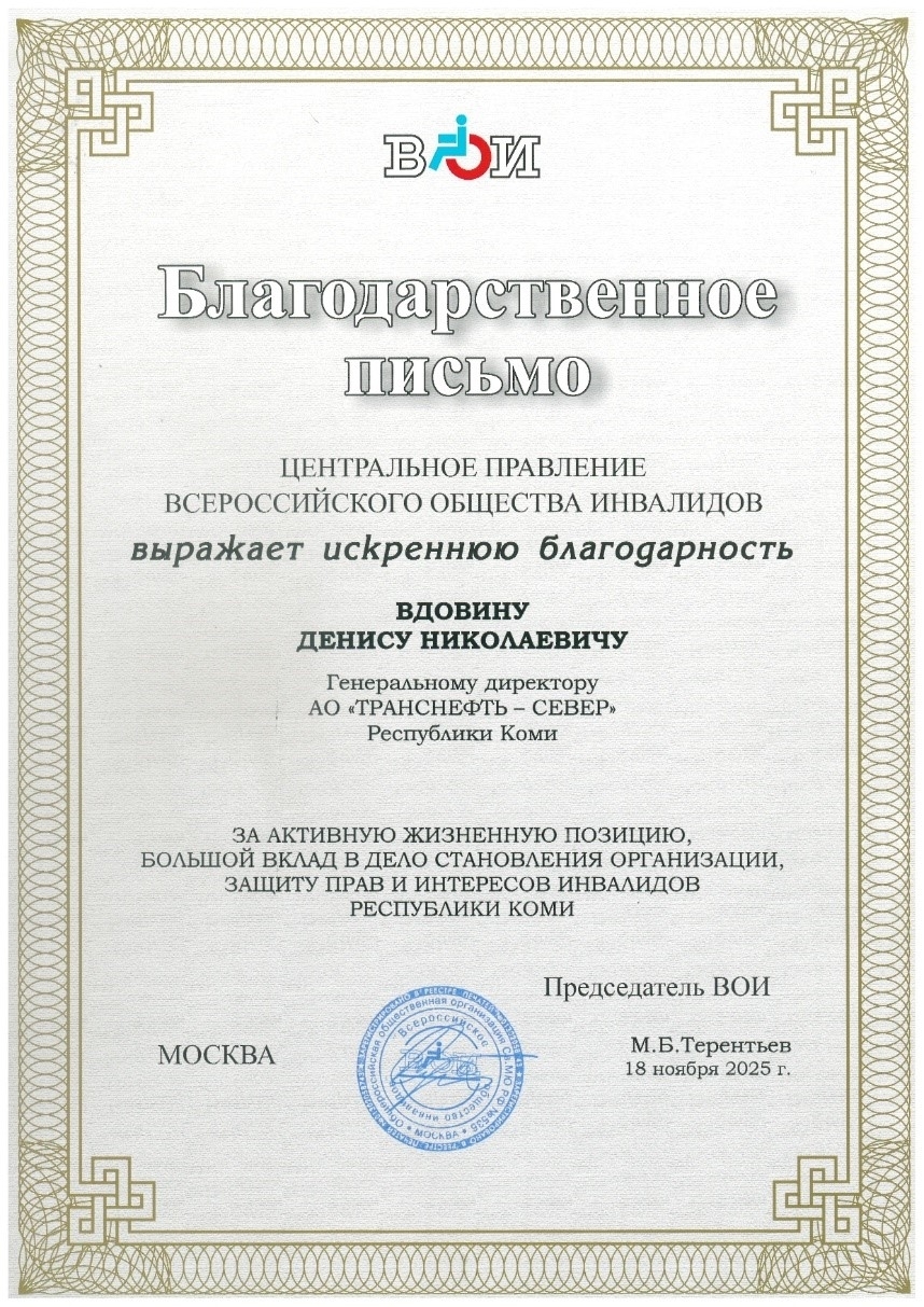 АО «Транснефть – Север» (дочернее предприятие ПАО «Транснефть») удостоено благодарственного письма от общероссийской общественной организации «Всероссийское общество инвалидов» (ВОИ) за активную жизненную позицию, значительный вклад в развитие организации и защиту прав и интересов людей с ограниченными возможностями здоровья в Республике Коми. Компания также получила высшую общественную оценку «5» от Коми республиканской организации ВОИ за глубокое понимание проблем людей с инвалидностью, включая участников специальной военной операции, при решении вопросов их трудоустройства.